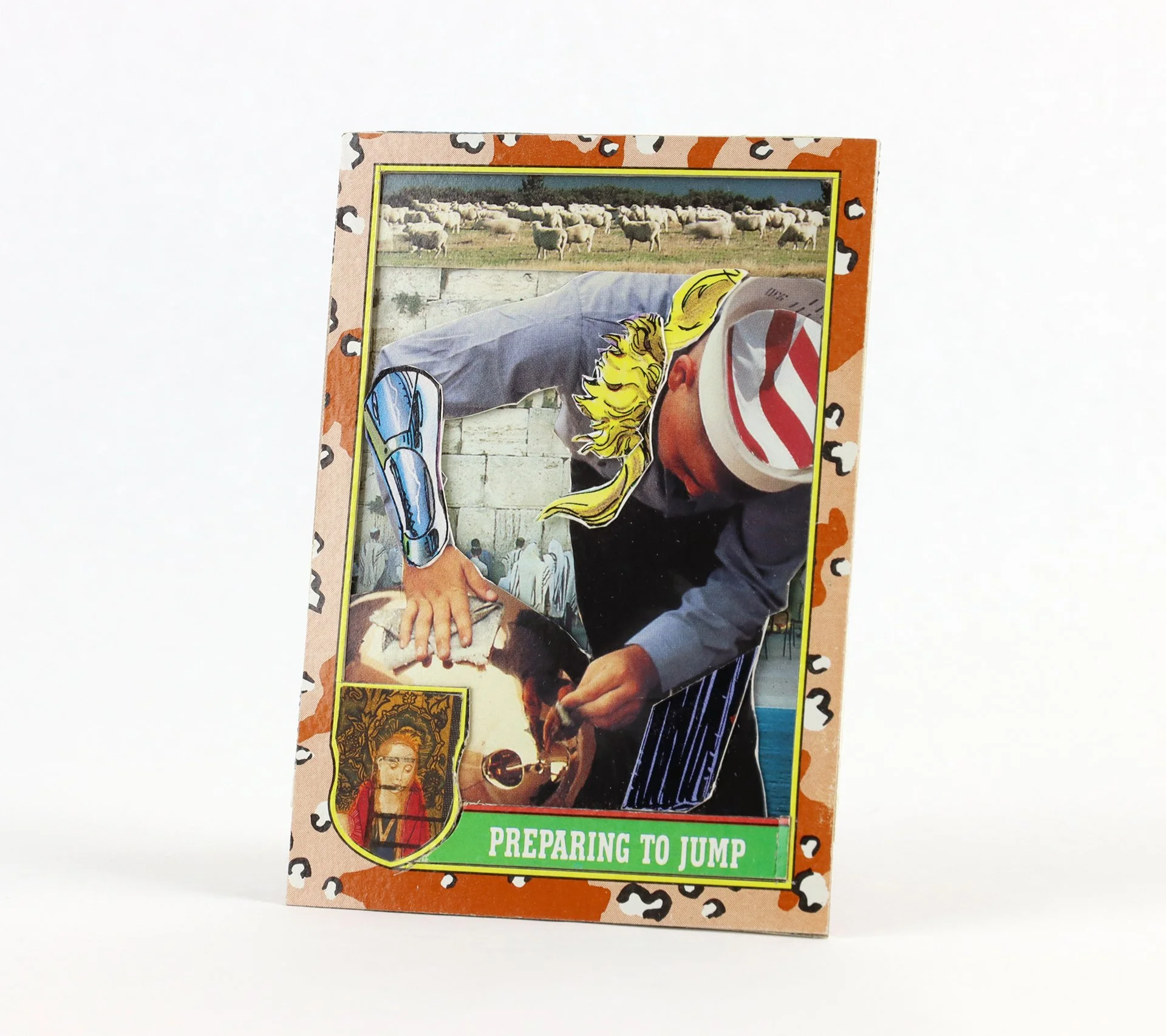 In this series, I satirize the hypermasculine messages depicted in collectible cards. Images of athletes, comic book characters, military personnel, and government entities are cut up and recast into absurdist vignettes that erode patriarchal narratives and American exceptionalism.